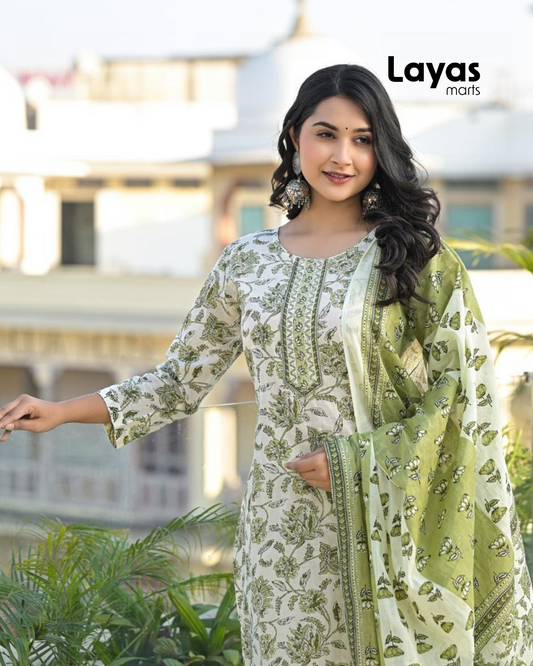 Cream White Floral Cotton Kurta Pant Dupatta Set – Layas Marts