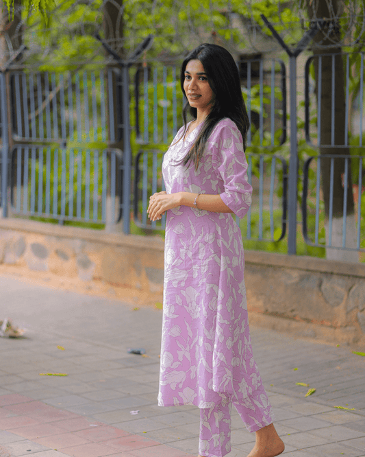 Elegant Lavender Cotton Floral Print Kurta Pant Set