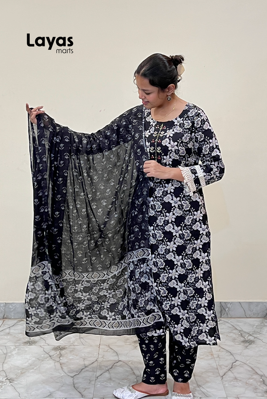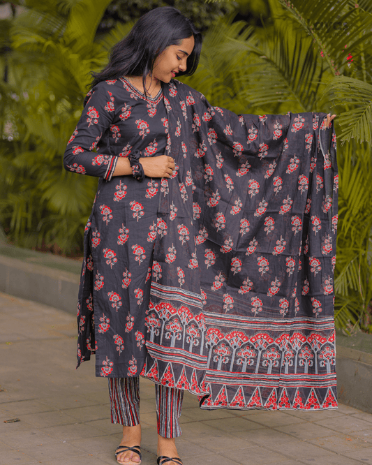 Amaira Black Floral Embroidered Cotton Kurta Set with Dupatta