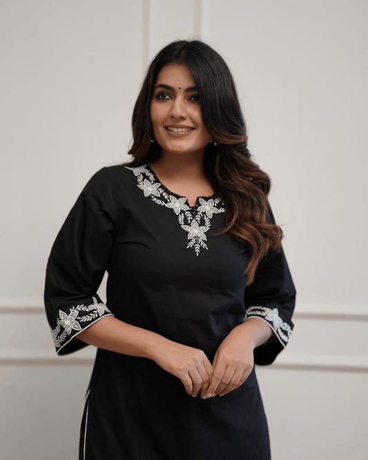 Black Chikankari Style Embroidered A-Line Kurta with Pant – Pure Cotton Set