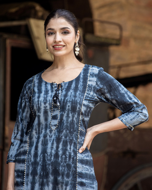 Blue Tie Dye Print Cotton Casual Kurta (Set of 1)