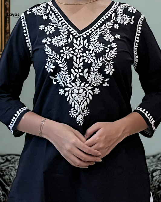 Black Pure Cotton Chikankari Embroidered Straight Short Kurti – Layas Marts