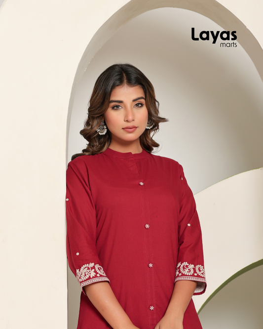 Red Chikankari Style Embroidered A-Line Kurta with Pant β Pure Cotton Set