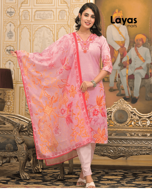 Pink Floral Printed Round Neck Regular Straight Kurta With Trousers & Dupatta