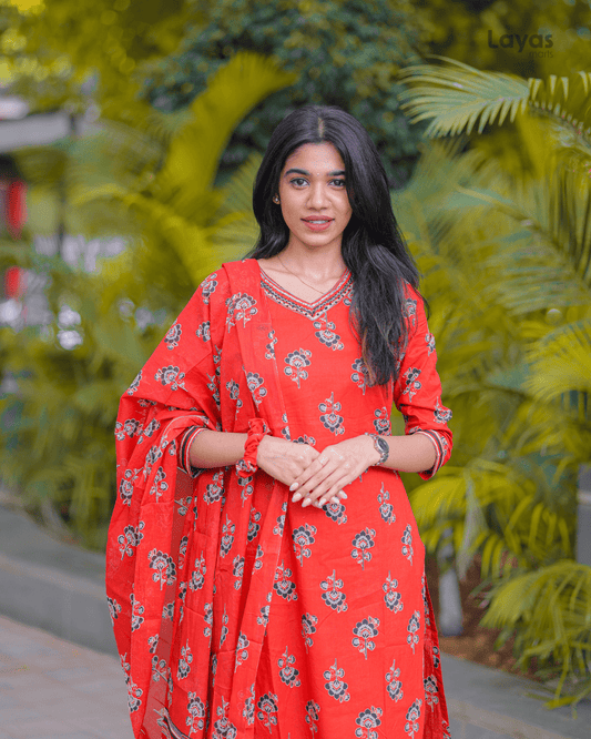 Red Motifs Printed Pure Cotton Straight Kurta with Palazzos & Dupatta