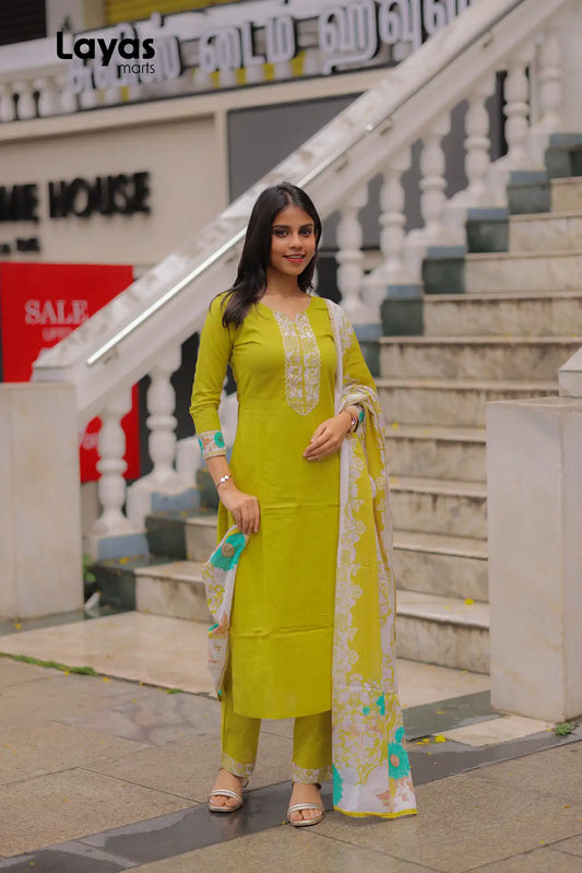 Green Floral Printed Round Neck Regular Straight Kurta With Trousers & Dupatta
