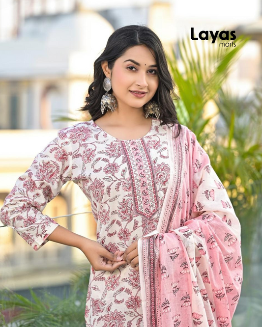 Cream White Floral Cotton Kurta Pant Dupatta Set β Layas Marts