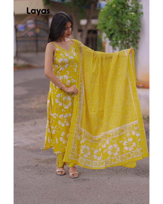 Yellow & Pink Floral Printed Cotton Kurta Set with Dupatta β Layas Marts