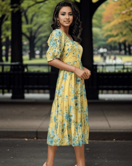 Stylish Yellow Floral Georgette Midi Dress