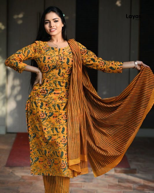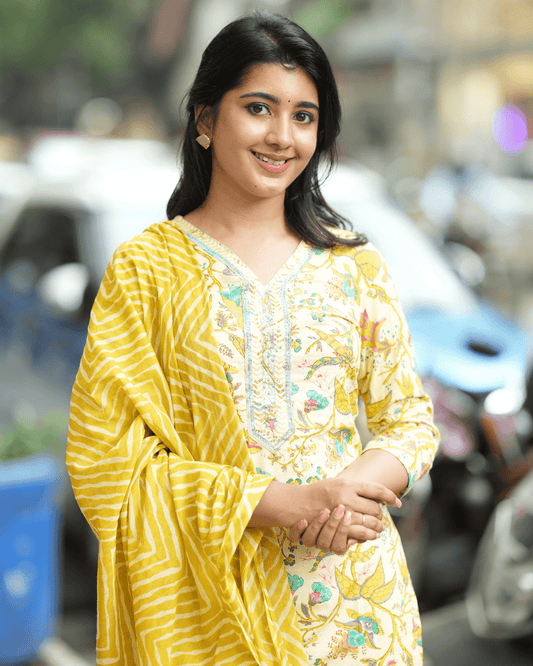Yellow Floral Printed Cotton Suit Set