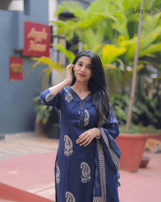 Navy Blue Floral Cotton Kurta Pant Dupatta Set – Layas Marts