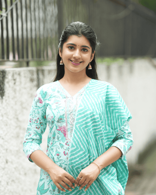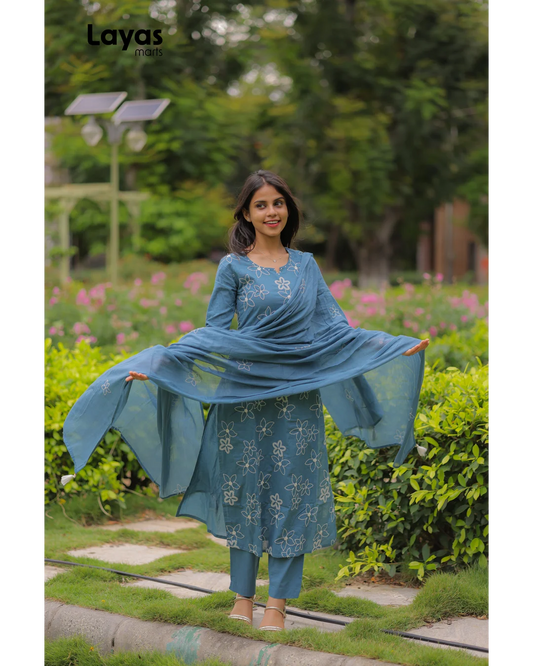 Teal Floral Cotton Kurta Set with Dupatta – Layas Marts