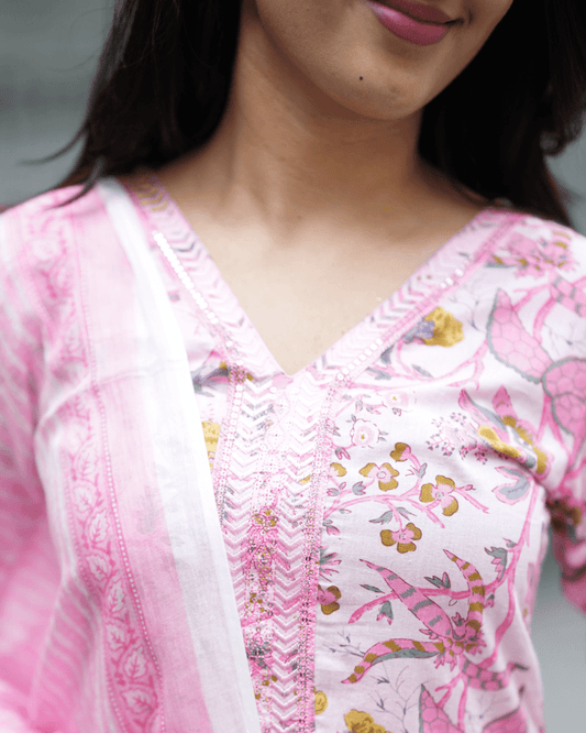 Pink Floral Cotton Kurta Set – Layas Marts