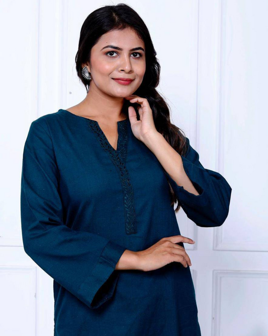 Navy Blue Cotton Embroidered Double Pocket Kurta with Trouser