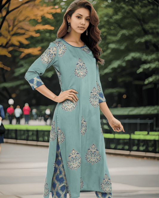 Turquoise Green Foil Print Kurta Set – Layas Marts