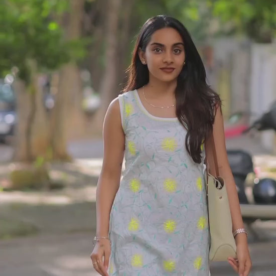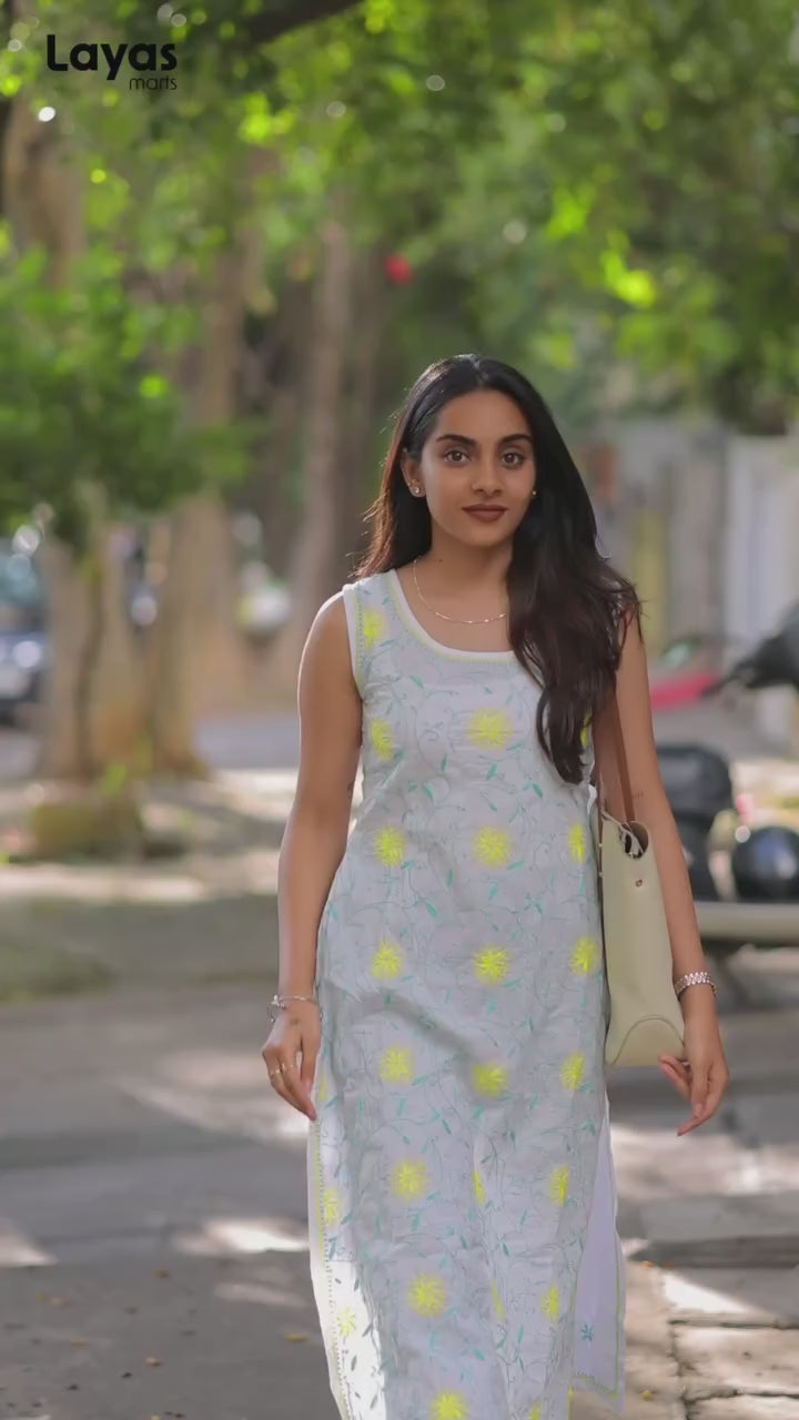 Crafted by skilled artisans, this Aqua Green & Yellow Sleeveless Chikankari Kurta showcases intricate Pechni stitch hand embroidery on a pristine white cotton base. Featuring delicate floral motifs, a classic round neckline, and high side slits, this kurta blends traditional Lucknowi craftsmanship with contemporary elegance.