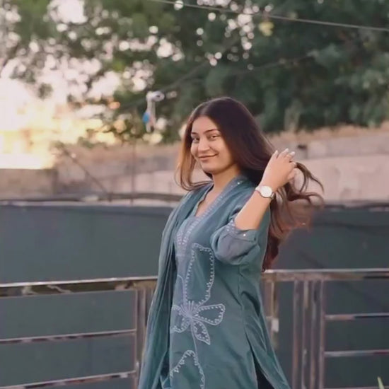 Subtle sophistication meets artisanal detailing in the Blue Grey Mul Chanderi Embroidered Kurta Set from Layas Marts.