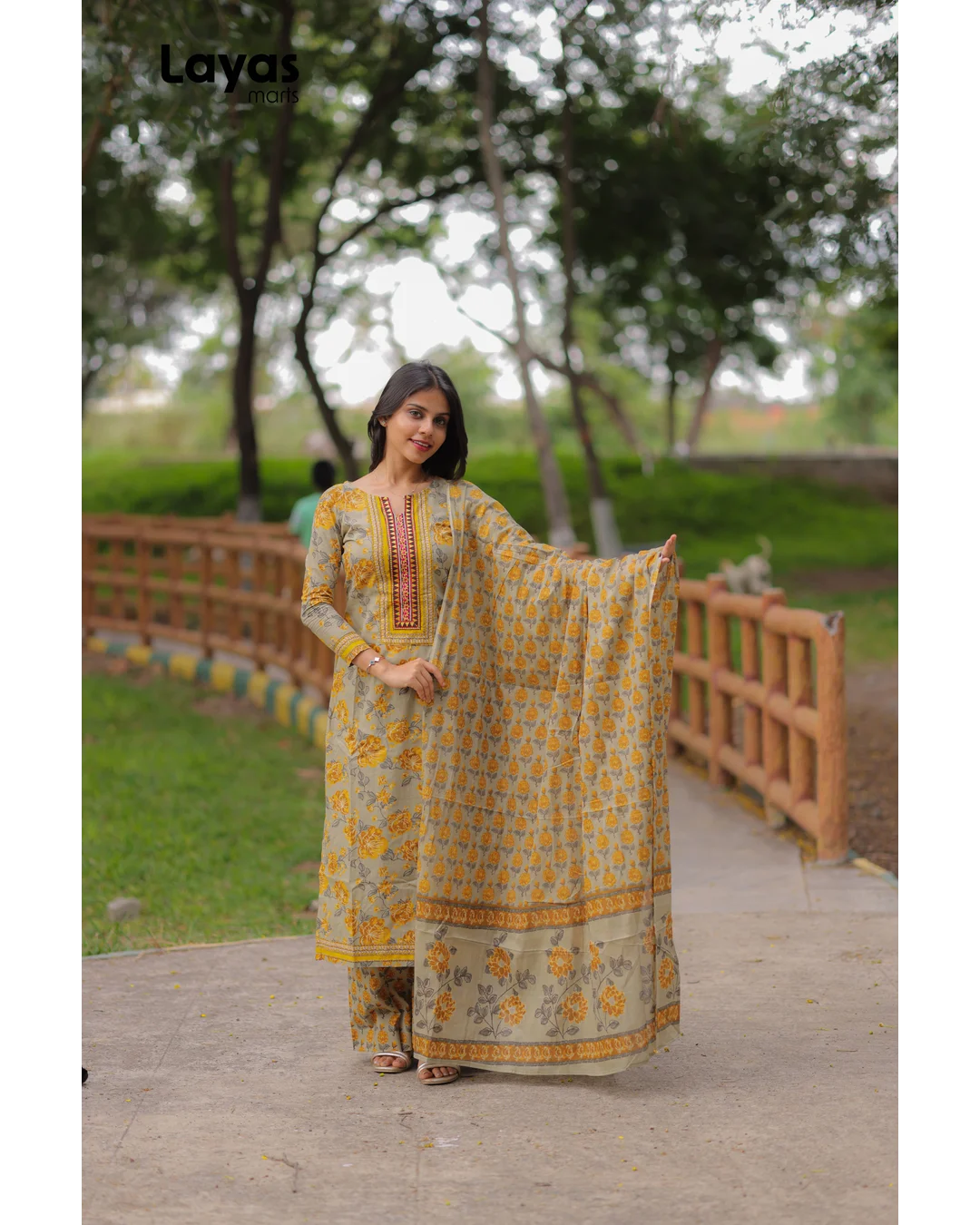 Add heritage charm to your wardrobe with this Mustard Grey Cotton Printed Kurta Set with Dupatta from Layas Marts. Crafted in breathable Jaipur cotton, the kurta features mustard floral prints on a soft grey base, a straight silhouette, and an embroidered neckline for a graceful finish.