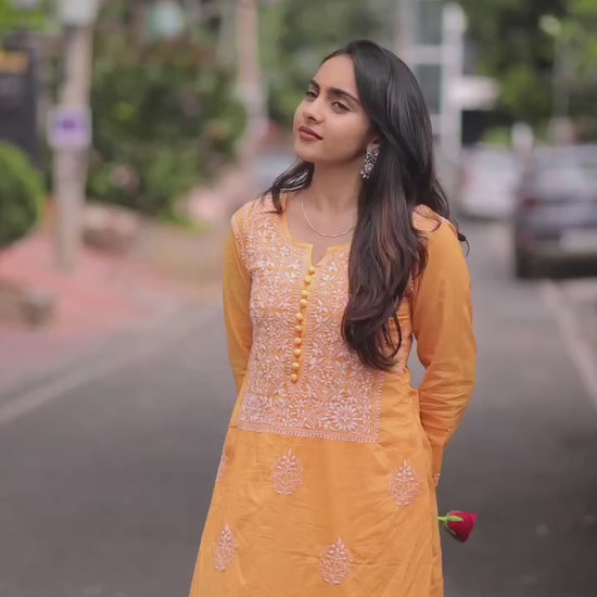 Brighten your everyday ethnic wardrobe with this Orange Cotton Chikankari Straight Kurta from Layas Marts. Crafted in breathable pure cotton muslin, this kurta features intricate hand-embroidered Chikankari motifs that celebrate timeless Indian craftsmanship.