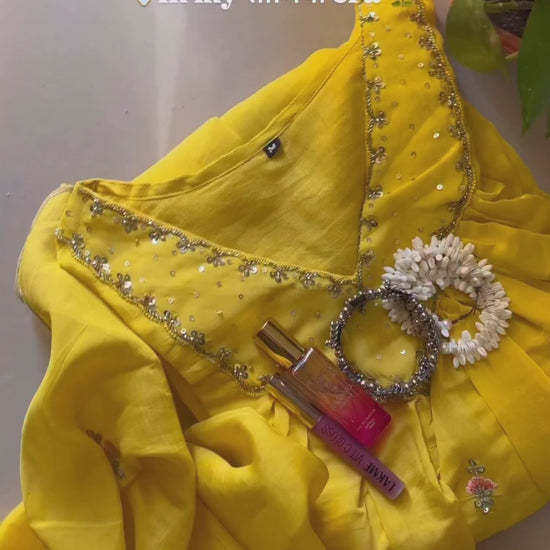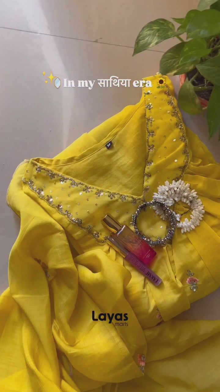 Designed in an A-line empire silhouette, the kurta falls gracefully with a flared hem, offering a flattering fit for all body types. The V-neckline, three-quarter sleeves, and calf-length design make it perfect for festive occasions, haldi functions, family events, and elegant day celebrations.